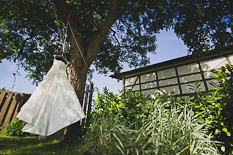 Im Ernst, wenn Du die Mutter der Braut begeisterst, dann wird die Hochzeit wirklich entspannend. Ich habe mal auf einer Hochzeit bei der Vorbereitung das Brautkleid ausgepackt. Klar, es war mit der Braut abgesprochen. Als ich allerdings gesagt habe, dass ich damit rausgehe, konnte ich den fesselnden und vernichtenden Blick der Schwiegermutter in meinem Nacken ahnen. Im Abstand keiner Sekunde schlossen sich die Freundinnen der Braut an. Und Ihre Blicke waren selbstredend: Passiert IRGENDETWAS mit dem Brautkleid, dann passiert IRGENDETWAS mit Dir. Die Aufnahme habe ich trotzdem gemacht. Und war Schweiss gebadet. Das Ergebnis seht Ihr links�